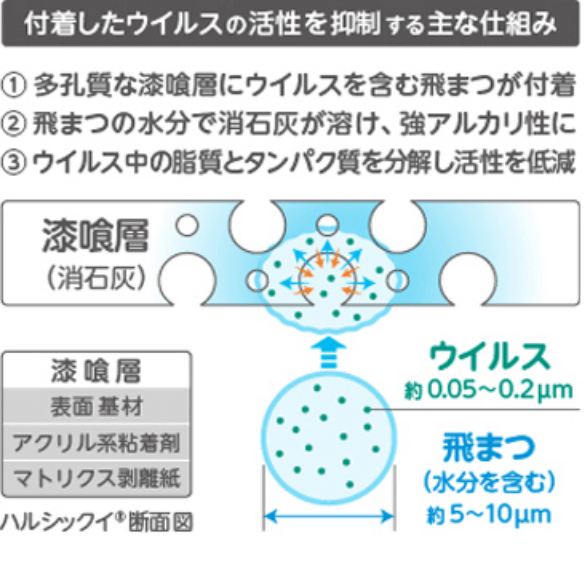 細菌の生育・増殖を抑制。シートの表面にコーティングされた漆喰の原料の「消石灰」が強アルカリ性のため、吸着した菌の活性を低減します。