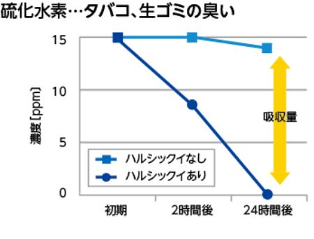 ※ハルシックイ(150mm×150mm)を5Lテドラーバッグにセットし、一定濃度の硫化水素またはメチルメルカブタン含有空気を封入して系内の該当化合物濃度を測定